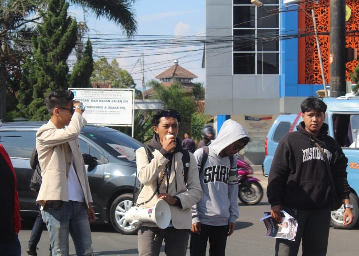Sejumlah personal dari Rakyat Bawah Kabupaten Garut berkumpul dan menyuarakan kritikan tentang pelaksanaan program Pendaftaran Tanah (PTSL) di depan kantor terpadu/ruang public bundaran Simpang Lima Garut.
