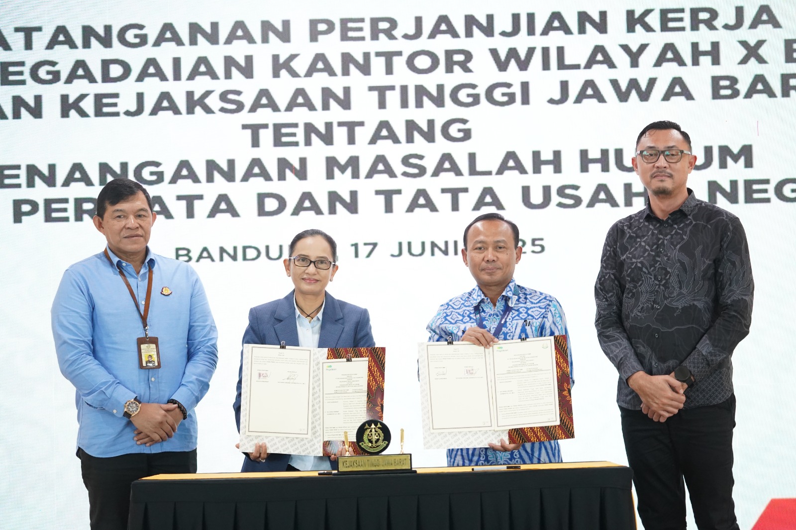 Kepala Kejaksaan Tinggi Jawa Barat, Katarina Endang Sarwestri, S.H., M.H didampingi Asisten Perdata dan Tata Usaha Negara Kejaksaan Tinggi Jawa Barat, Jasri Umar beserta jajaran menandatangani Perjanjian Kerja Sama dengan PT Pegadaian Kantor Wilayah X Bandung tentang Penanganan Permasalahan Hukum Bidang Perdata Dan Tata Usaha Negara bertempat di Ruangan R.Soeprapto Lt.8 Kejati Jabar, (17/06/25).