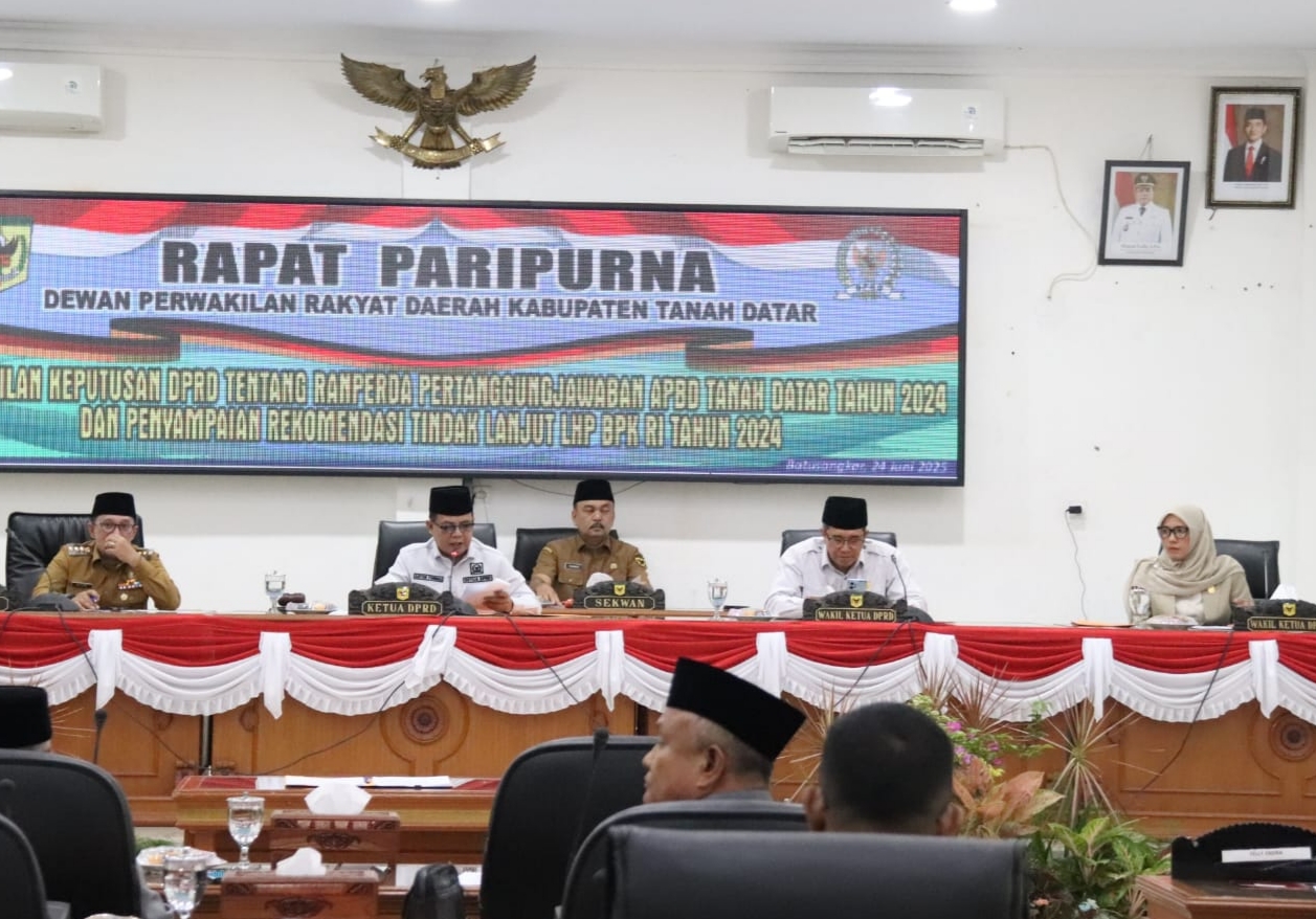 Pendapat akhir Badan Anggaran (Banggar) yang disampaikan Juru Bicara (Jubir), Nurhamdi Zahari, sebanyak 8 Fraksi DPRD Kabupaten Tanah Datar menerima Ranperda Pertanggungjawaban Pelaksanaan APBD Tahun Anggaran 2024 ditetapkan menjadi Peraturan Daerah (Perda).