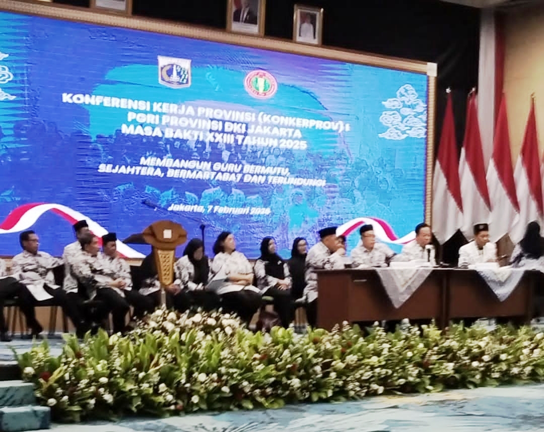 Dr. H. Adi Dasmin, MM selaku Ketua Umum PGRI Jakarta membuka Konfrensi Kerja Provinsi I PGRI DKI Jakarta Masa Bakti 23 Tahun 2025 di Gedung Dinas Pendidikan (Disdik) DKI Jakarta di ruang Auditorium Ki Hajar Dewantara lantai 5 Jl. Gatot Subroto No.Kav. 40-41, Kuningan, Kecamatan Setiabudi, Jakarta Selatan pada 7 Februari 2026.