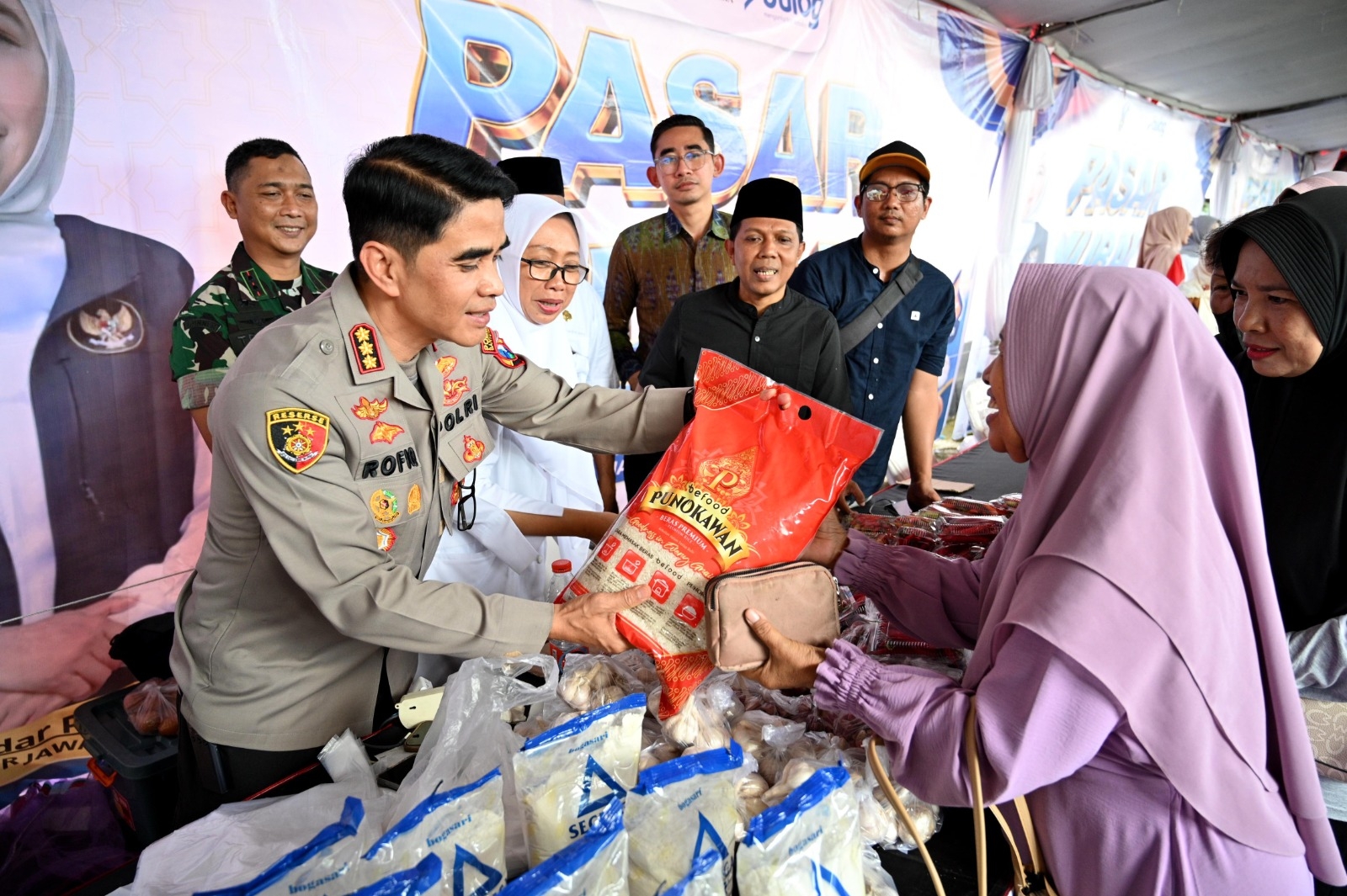 Dalam kegiatan itu, Kapolresta hadir bersama Komandan Kodim 0825 Banyuwangi Letkol (Arm) Tryadi Indrawijaya serta Kepala Dinas Koperasi, Usaha Mikro dan Perdagangan Banyuwangi Nanin Oktavinatie. Mereka juga menyerahkan secara simbolis bantuan beras kepada warga yang hadir di lokasi pasar murah.