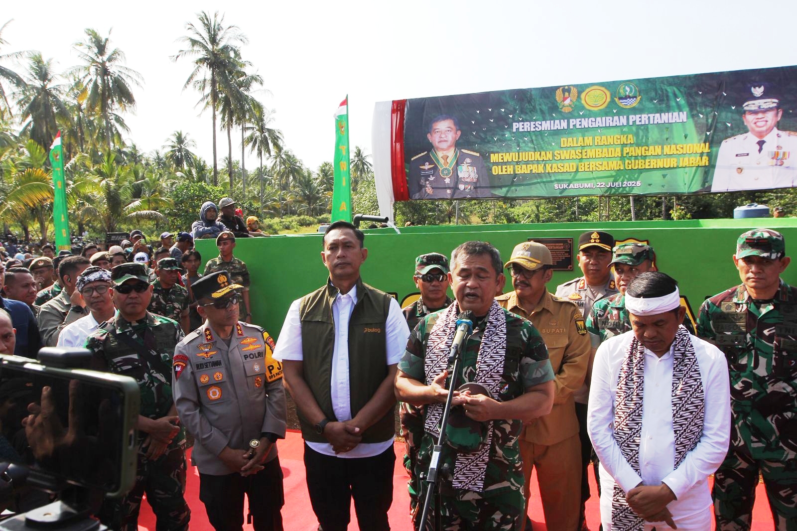 Kasdam III/Siliwangi Brigjen TNI Tato Hadiyan, S.I.P., M.Han., mewakili Pangdam III/Siliwangi, mendampingi Kasad Jenderal TNI Maruli Simanjuntak, M.Sc., dan Gubernur Jawa Barat H. Dedi Mulyadi, S.H., M.M., dalam rangka peresmian sarana pengairan di Kecamatan Ciracap, Kabupaten Sukabumi, Jawa Barat, Selasa (22/07/2025).