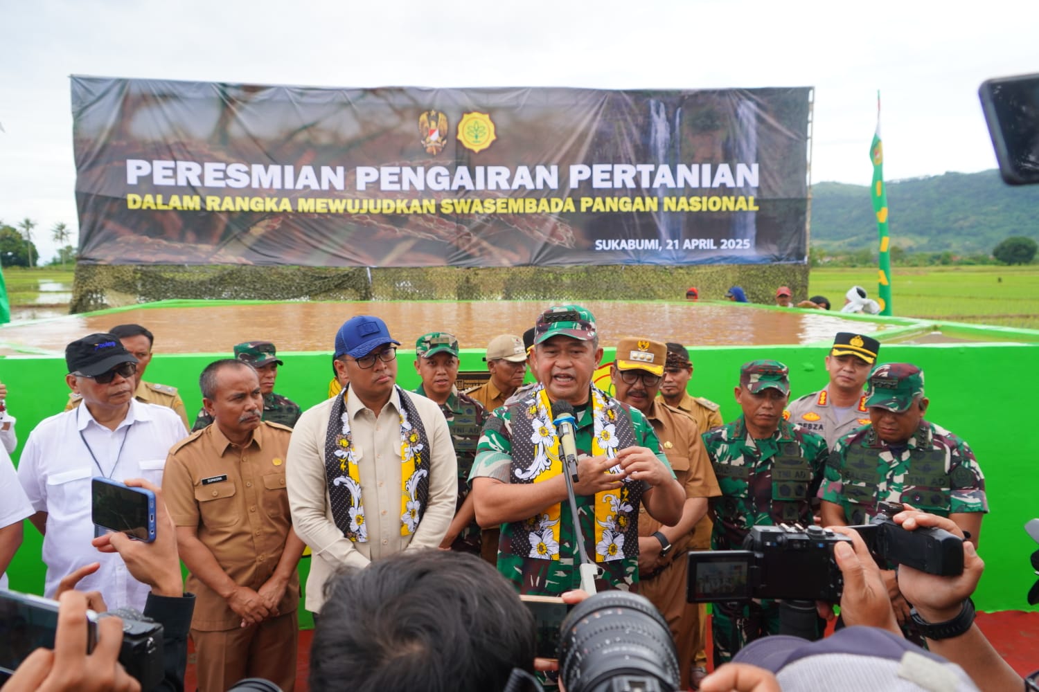 Kepala Staf Angkatan Darat (Kasad), Jenderal TNI Maruli Simanjuntak, M.Sc bersama Wakil Menteri Pertanian Sudaryono, B.Eng., M.M., MBA didampingi oleh Pangdam III/Slw, meresmikan sarana pengairan pertanian di Desa Ciwaru, Kecamatan Ciemas, Kabupaten Sukabumi, Senin (21/04/2025).