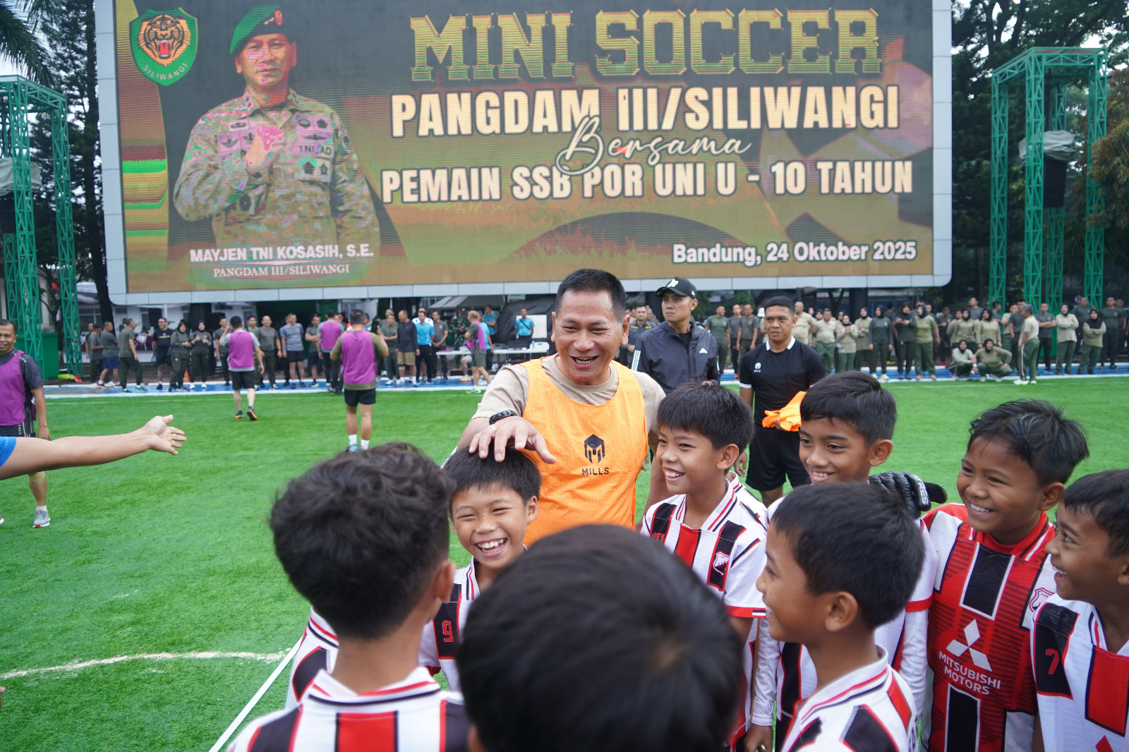Kodam III/Siliwangi menggelar pertandingan mini soccer persahabatan antara Pangdam III/Siliwangi Mayjen TNI Kosasih, S.E., bersama jajaran pejabat Kodam III/Siliwangi melawan tim SSB POR UNI U-10, di Lapangan Prajurit Kodam III/Siliwangi, Jalan Aceh No. 69, Kota Bandung, Jumat (24/10/2025).