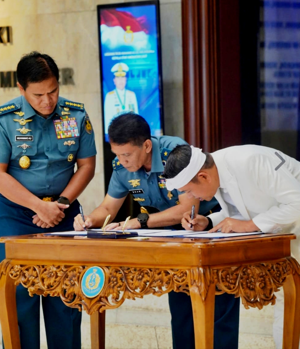 Pemerintah Daerah Provinsi (Pemdaprov) Jawa Barat (Jabar) meneken kerja sama dengan Tentara Nasional Indonesia (TNI) Angkatan Laut (AL) di Gedung R.E. Martadinata Markas Besar TNI AL Cilangkap, Jakarta Timur, Rabu (25/6/2025). Kolaborasi tersebut bertujuan mengembalikan fungsi sungai dan laut sebagai sumber kemakmuran masyarakat.