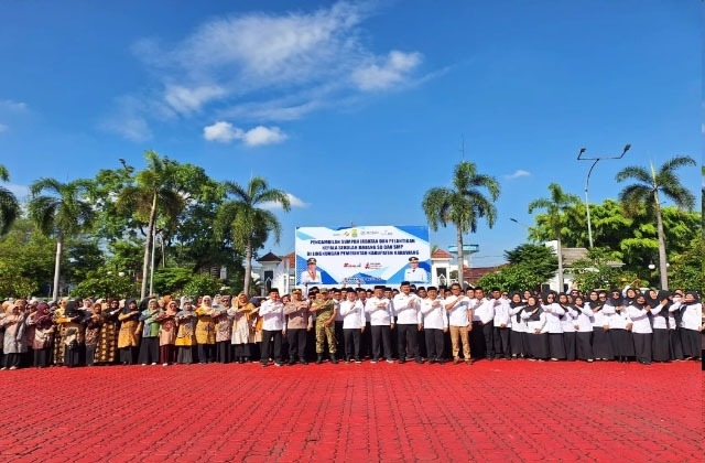 Bupati Karawang Aep Syaepuloh melantik dan mengambil sumpah jabatan 199 Kepala Sekolah SD dan SMP di Plaza Kompleks Perkantoran Pemda Karawang, Jumat (24/4/2026).