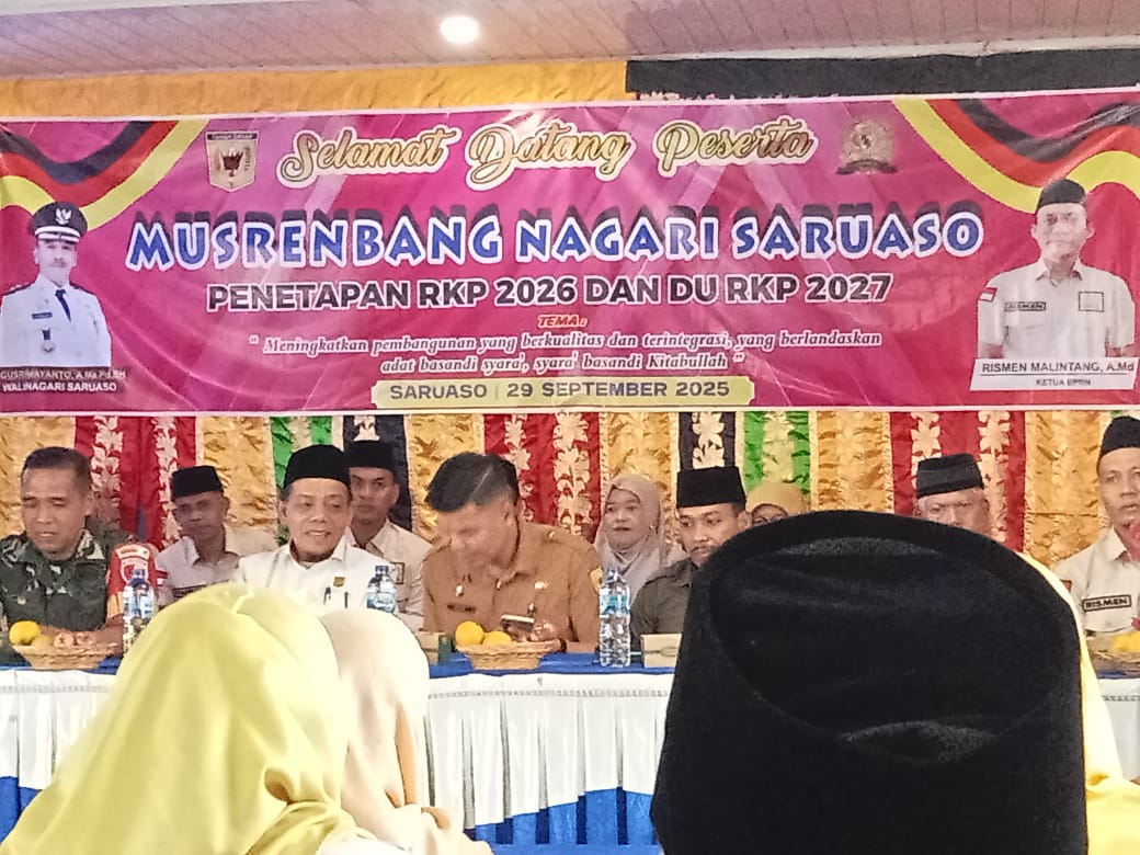 Musrenbang kali ini difokuskan pada penetapan Rencana Kerja Pemerintah (RKP) Nagari tahun 2026 serta penyusunan Daftar Usulan RKP (DU RKP) tahun 2027. Kegiatan ini dihadiri oleh seluruh elemen masyarakat Nagari Saroaso, mulai dari tokoh adat, tokoh agama, perwakilan pemuda, kelompok perempuan, hingga unsur pemerintahan nagari.
