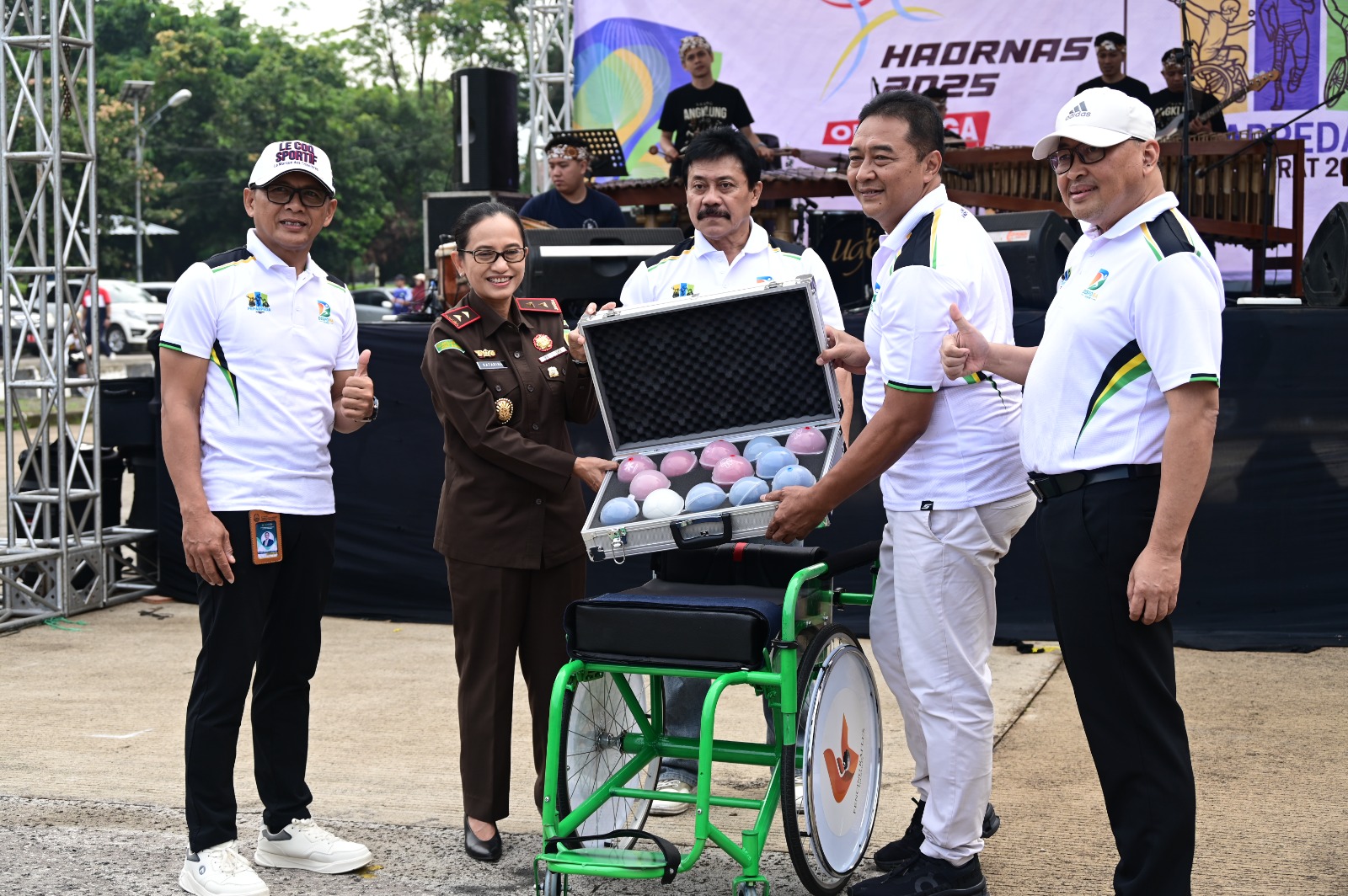 Dalam kesempatan tersebut, Kajati secara simbolis berkesempatan menyerahkan bantuan berupa alat-alat olahraga kepada perwakilan atlet dari Nasional Paralympic Comitee Jawa Barat.