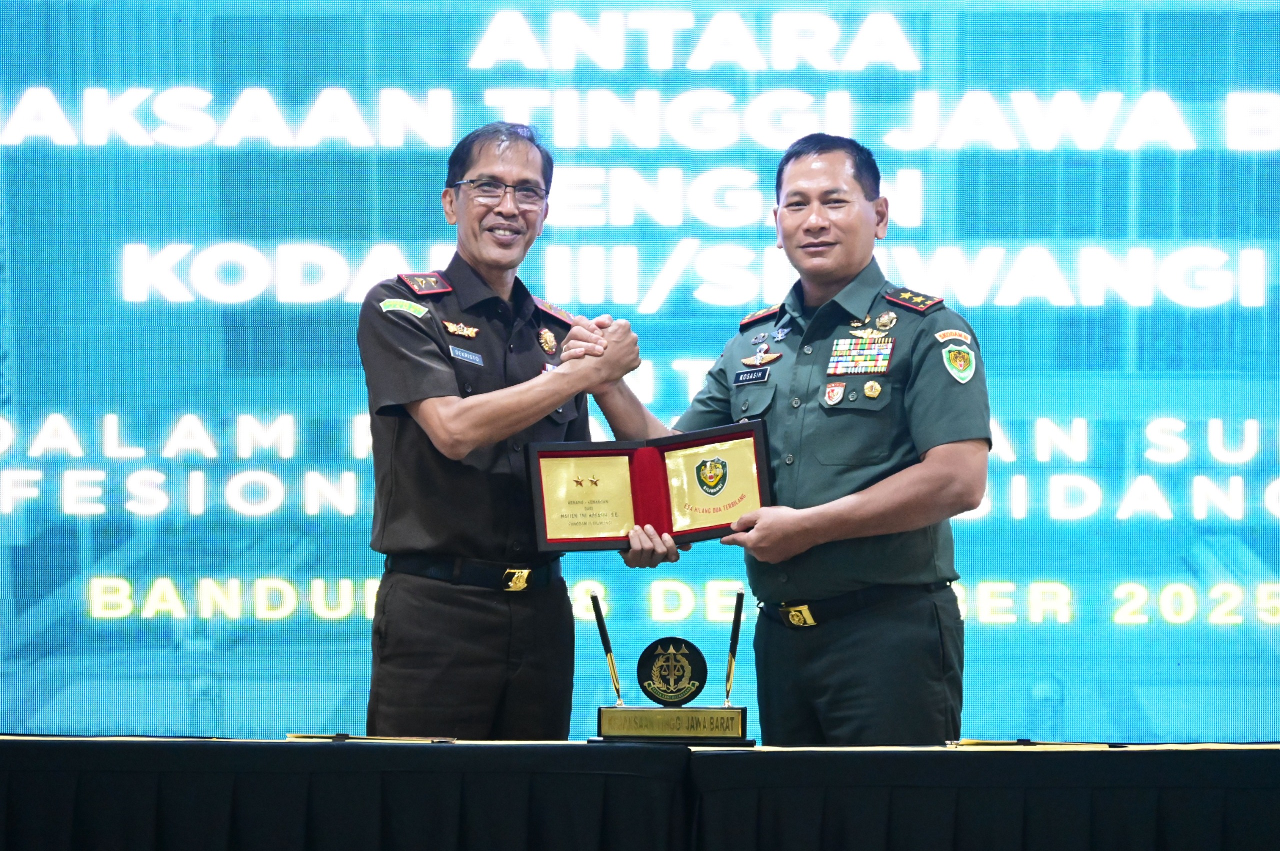 Kajati Jabar Dr. Hermon Dekristo, S.H., M.H menandatangani Perjanjian Kerjasama antara Kejaksaan Tinggi Jawa Barat dengan Komando Daerah Militer III/Siliwangi yang ditandatangani oleh Panglima Kodam III/Siliwangi Mayor Jenderal TNI Kosasih, S.E. diselenggarakan di Aula R.Soeprapto Kejati Jabar, Kamis (18/12/25).