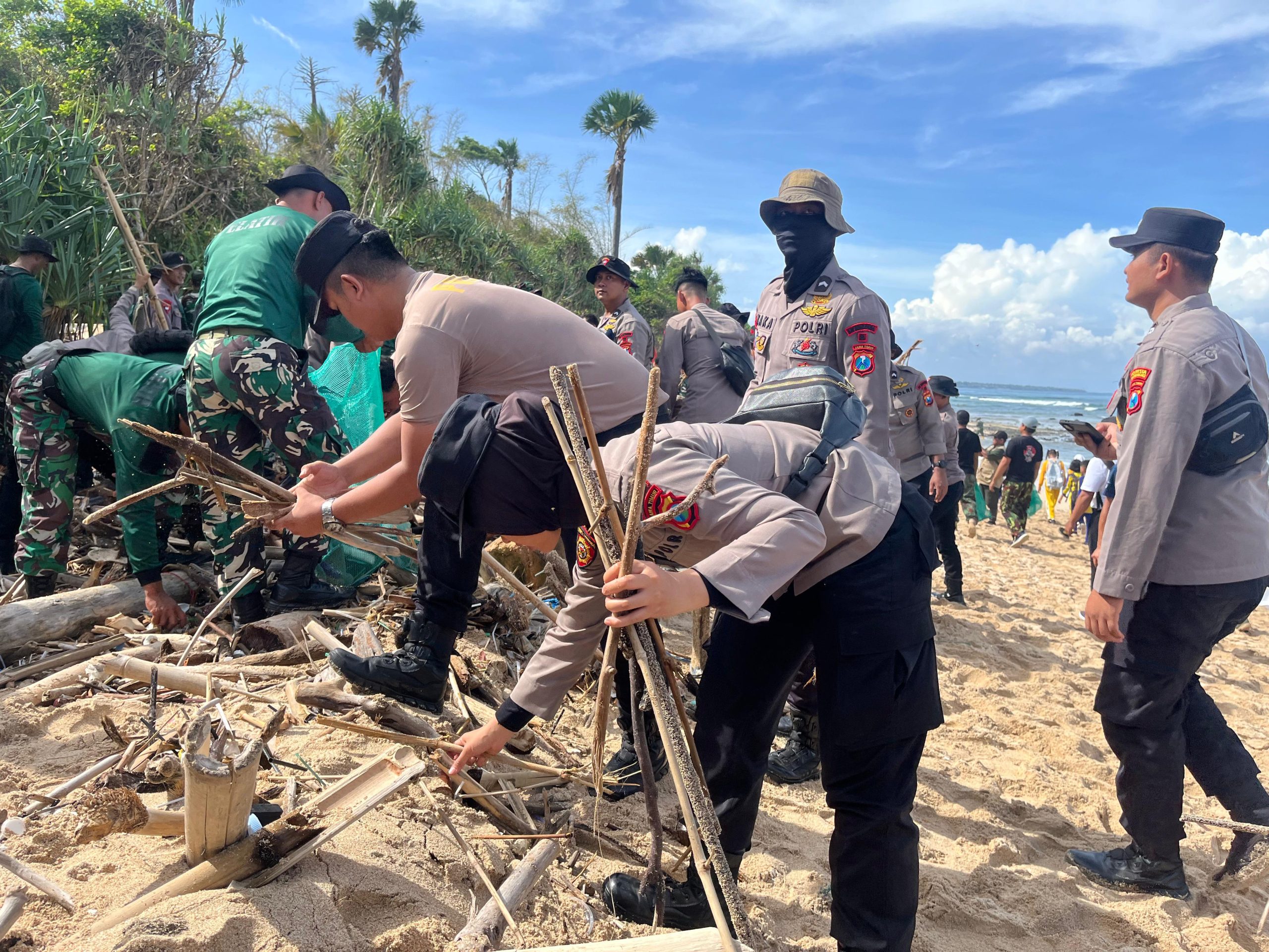 Dalam kegiatan tersebut, personel Polresta Banyuwangi bersama peserta lainnya melakukan pembersihan sampah di sepanjang pesisir Pantai Pancur.